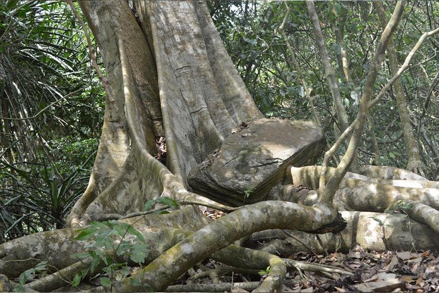 Rock bearing tree – Rock stuck on exposed tree roots for years